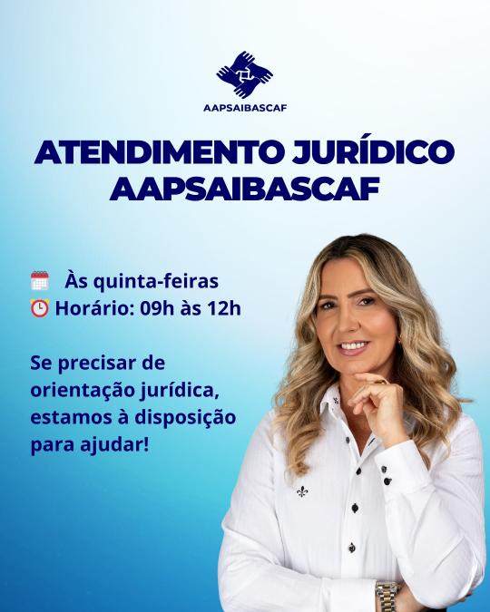 Toda quinta-feira, das 09h às 12h, a AAPSAIBASCAF oferece atendimento jurídico exclusivo com a Dra. Débora Viana, diretamente em nossa sala. Mais do que um benefício, é um suporte essencial para que nossos associados tenham orientação segura e confiável em questões de aposentadoria, pensão e direitos. Venha garantir o apoio que você merece!