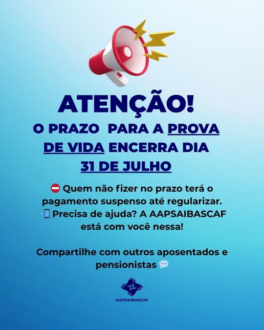 Lembre-se: o prazo para a realização da prova de vida do IBASCAF encerra no dia 31 de julho. É essencial que todos os aposentados e pensionistas realizem a comprovação de vida dentro do prazo para garantir a continuidade dos benefícios. Não deixe para última hora!